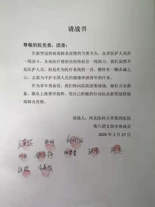 面对来势汹汹的疫情,作为医院的年轻力量,广大团员青年牢树大局意识,服从组织安排,积极踊跃请战。临床一线的青年医护工作者发出了“服从安排,随时出征,不计报酬,无论生死”的铮铮誓言;后勤行政的青年同志们表示,“作为医疗系统的一员,作为青年预备役,已做好万全准备,到最需要的地方去”。一份份情真意切的请战书,一枚枚鲜红的手指印,彰显了我院广大青年无畏艰险、勇挑重担的精神风貌。