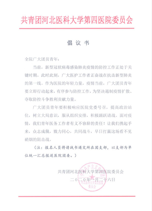 当前,新型冠状病毒感染肺炎疫情的防控工作正处于关键时期。1月26日,医院团委发出倡议书,号召广大团员青年积极响应医院党委号召,立即行动起来,有序参与防控,为坚决遏制疫情扩散、夺取防控斗争胜利贡献力量。