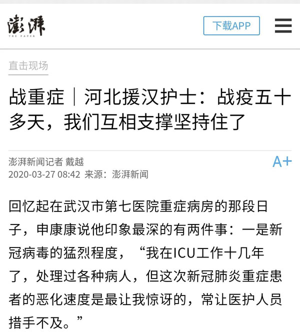 “ICU里的护士和普通病房里的护士完全不是一个概念,在新冠肺炎ICU做护士更辛苦忙碌。”申康康如是告诉澎湃新闻。