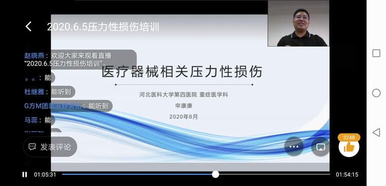 尹彦玲护士长是我省乃至国内的知名重症护理专家,同时担任我院皮肤管理和重症护理两个护理专业学组的组长,在患者皮肤管理方面具有丰富的临床经验。她从皮肤的结构和功能、损伤的类型等基础知识入手,带领听众逐步了解压力性损伤概念的变迁史、分期,重点解读了《2019版压力性损伤指南》中对患者发生压力性损伤的风险评估、皮肤和组织评估、预防性皮肤护理等更新内容。申康康副护士长以指南为基础,具体讲解了医疗器械相关性压力损伤的概念、临床常见类型、分期,特别分享了从管理和技术两个层面如何预防和处理医疗器械相关性压力损伤。两位重症护理专家应用了大量的临床案例和图片,对指南进行了深入浅出、生动具体的解读。