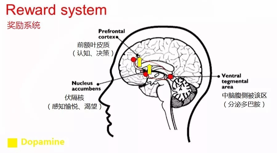 当进食大量糖后,大脑内的多巴胺的分泌增加,多巴胺将讯号传送给大脑的伏隔核。伏隔核掌控着我们的快乐、成瘾、恐惧、安慰剂效应等,而且它还与前额叶皮层连结。大脑会将这种快乐的滋味记录下来,并且鼓励你重复去做这一行为, 吃糖,我开心,大脑记住了,继续吃……这属于大脑的一种奖赏机制。