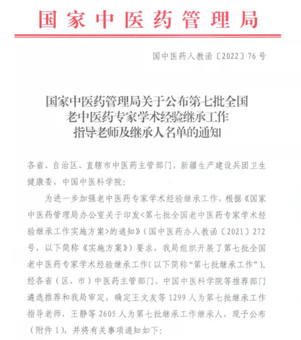近日,国家中医药管理局公布了“第七批全国老中医药专家学术经验继承工作指导老师及继承人名单”,我院中医科刘亚娴教授入选全国第七批指导老师,这也是他连续5批次(全国第三、四、五、六、七批)入选全国指导老师。中医科李建波主治医师入选全国第七批继承人,将跟随刘亚娴教授开始为期3年的跟师学习、理论研究和临床实践。