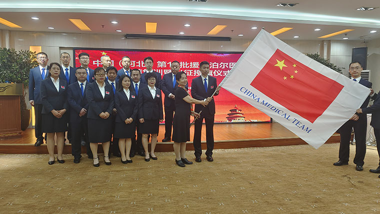 6月10日,河北省卫健委举行中国(河北)第14批援尼泊尔医疗队行前集训暨出征授旗仪式。我院血液内科病区主任刘海生同志,代表医院前往尼泊尔执行为期一年的援外医疗任务。赵群副院长、人事处韩国军处长代表医院参加送行仪式。该医疗队由17人组成,已于6月12日从成都出境并顺利抵达目的地。