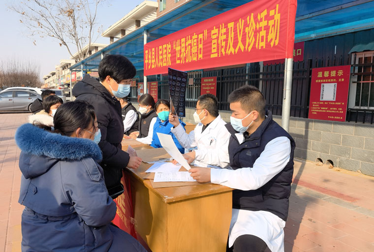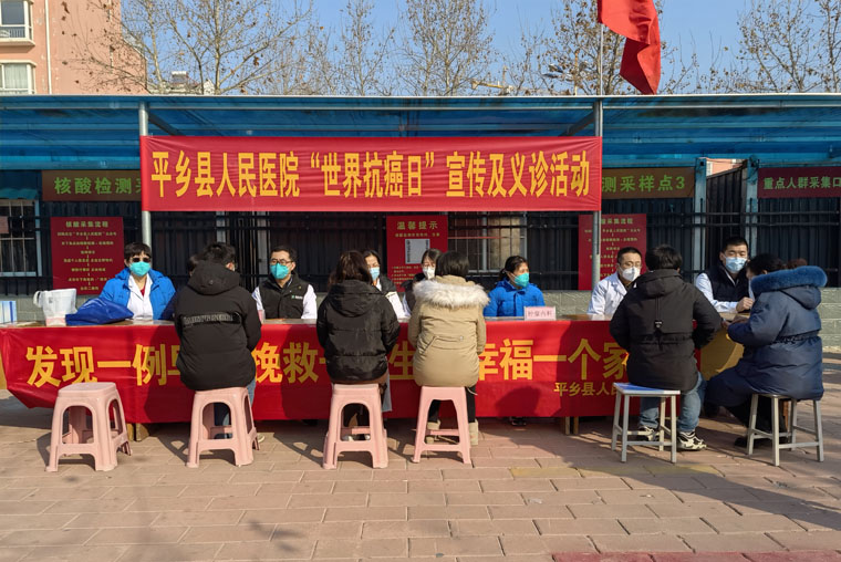 2023年2月4日是第23个世界抗癌日。2月3日,在平乡县人民医院的组织下,我院驻平乡对口支援医疗队的耳鼻喉科刘胜辉、放疗科许金蕊、外三科田园、病理科刘尧与县医院的同事共同开展了“世界抗癌日”义诊宣教活动,共发放防癌、抗癌科普知识宣传单及小礼品300余份,接受患者群众咨询100余人次,现场气氛热烈,得到广泛好评。