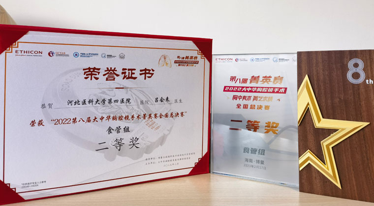 在“第八届大中华胸腔镜手术菁英赛”系列比赛中,东院区胸心外科病区副主任吕会来分别以腔镜食管组手术省内选拔赛第一名、晋冀蒙赛区第一名,北中国赛区第一名的成绩晋级全国总决赛。来自海内外的116名胸外科领域权威专家组成总决赛评委团,吕会来医生秉承“严于术前、精于术中、善于术后、综合展示”的手术理念,用英文呈现了1例局晚期食管鳞癌经综合治疗后成功微创手术的案例,得到评委的一致认可,获得全国二等奖的好成绩,充分展示了我院胸外科的综合实力。