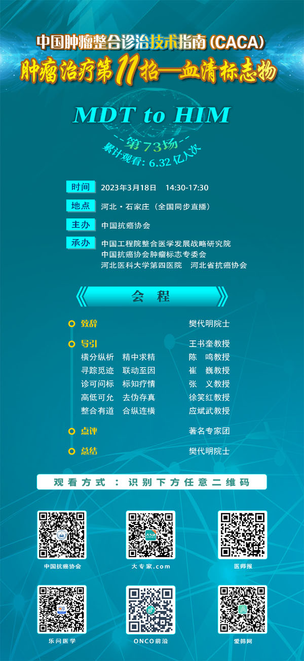 “CACA技术指南精读巡讲-血清标志物专场”活动将于3月18日(周六)14:30-17:30隆重召开,活动由中国抗癌协会主办,中国工程院整合医学发展战略研究院、中国抗癌协会肿瘤标志专委会、河北医科大学第四医院、河北省抗癌协会承办。发布会环节由中国抗癌协会副理事长张建功教授主持,中国抗癌协会理事长樊代明院士特邀著名专家团进行点评,南京医科大学附属南京医院王书奎、陆军军医大学西南医院陈鸣、中国医学科学院肿瘤医院崔巍、山东大学齐鲁医院张义、中国科学院大学附属肿瘤医院徐笑红、四川大学华西医院应斌武等教授,就医学界和公众最关注的肿瘤诊疗高招之一——肿瘤血清标志物中的热点问题,开展系统、精彩的专题讲座。中国抗癌协会及河北省多位领导出席会议,见证CACA指南发布及认证专家证章颁发仪式。精读巡讲活动将通过中国抗癌协会客户端APP及数十家权威媒体直播。伴随指南的发布暨精读巡讲会议的召开,协会启动指南进校园、医师认证、中国行基层培训、国际合作推广、短视频创作、媒体访谈、患教科普、指南应用工具开发等一系列指南解读推广活动,掀起新一轮全国“学指南、用指南、遵规范”的热潮。