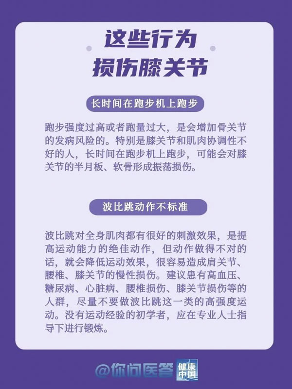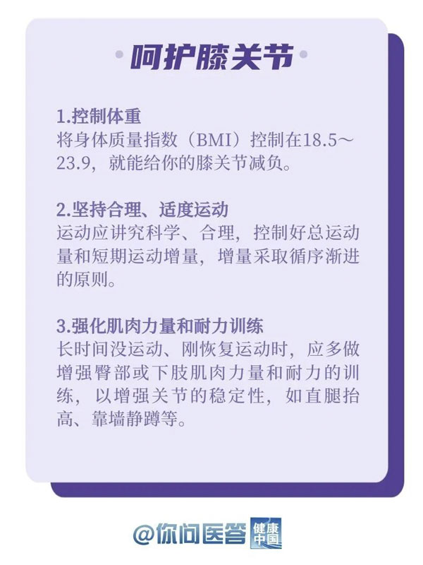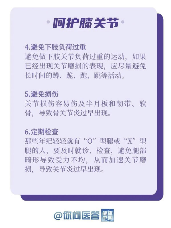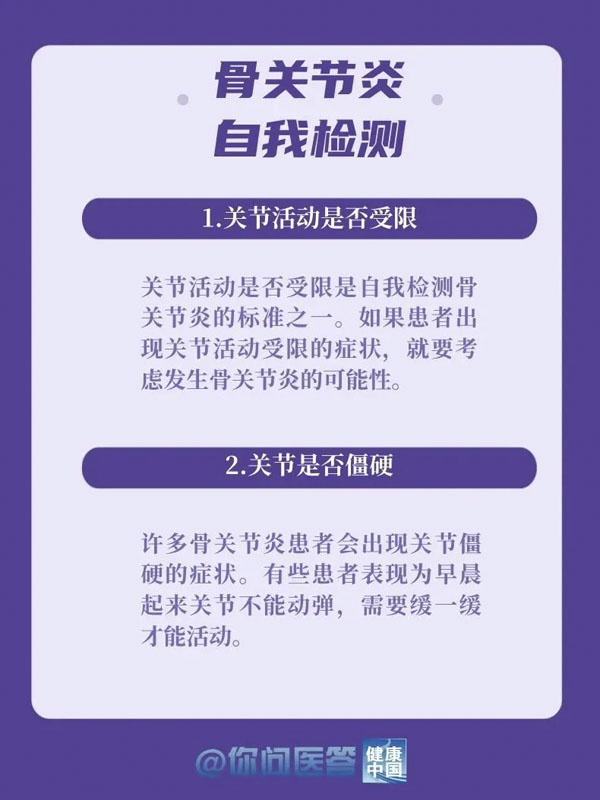 10月12日是世界关节炎日。关节炎是常见的慢性疾病之一。关节炎的种类繁多,其中以骨关节炎患病率最高。骨关节炎好发于负重关节及活动量较多的关节,如膝关节、髋关节等。你的膝关节还好吗?生活中,有哪些常见的“伤膝”行为?保护关节,转给你关心的人!