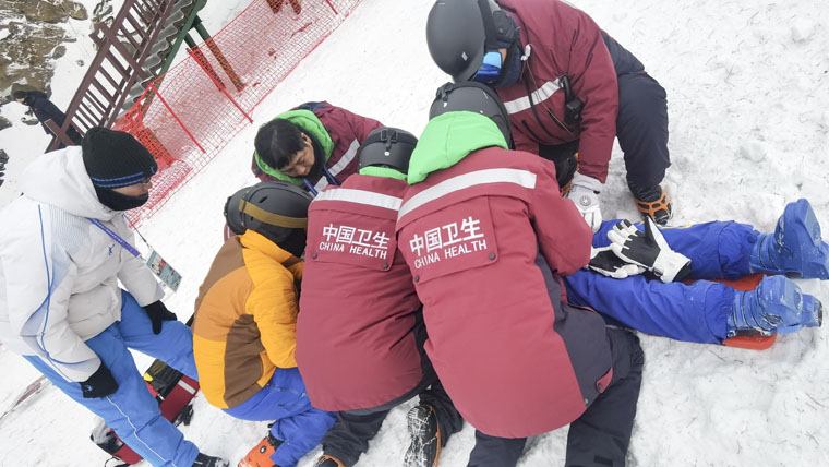 整个赛程,我下赛道查看摔倒运动员7次,其中4人经过短暂恢复后自行离开赛道,另外3人伤势较重,无法自行离开,验伤后由救援拖船拖离,其中2人令我印象深刻。一名运动员在单板U型池男子预赛期间腾空后未落到U型池壁上,在空中失去平衡,面部朝下,重重地摔在地上。我第一时间穿上雪板,经起点长示意后迅速进入赛道查看情况,发现其意识淡漠,勉强有回应;雪镜卡在嘴里,有出血,我紧急处理后由救援船直接拖至120救护车送医院予以进一步诊治。另一名运动员是我本次保障任务中受伤最重的一位,他是一名单板坡面障碍运动员,在进行赛前训练时,经由一个缓坡飞起,落在一个纵向的平衡木上时掉下,头部摔在平衡木上,后重重摔在地上,发出一声闷响。当时我和另一位保障队员正在关注这名运动员,夸赞其技术好,意外发生后,我俩第一时间冲过去,运动员已意识不清、牙关紧闭,摘掉其雪镜后,发现双眼上吊、口腔分泌物较多、无法自行排除,怕出现窒息情况,我和另一名队员主导,其他几人配合,对其置入口咽通气道以保持呼吸通畅,后将其固定在脊柱板,抬上救援拖船后送至救护车上,迅速转运至定点医院。