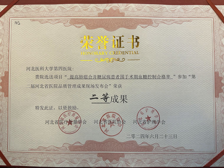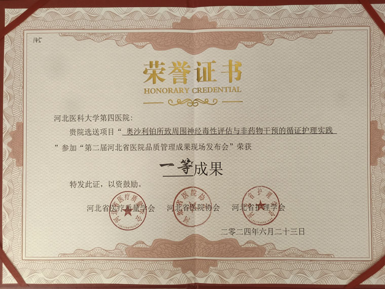 我院获得的奖项包括一等奖1项,为消化内科“奥沙利铂所致周围神经毒性评估与非药物干预的循证护理实践”;二等奖2项,为胸三科“提高肺癌合并糖尿病患者围手术期血糖控制合格率”和放疗科(东)“提高跌倒高风险患者预防跌倒坠床措施落实率”;三等奖2项,为骨科“提高骨科大手术患者术后踝泵运动的正确率”和胸六科“提高胸外科术后患者呼吸功能锻炼规范率”。