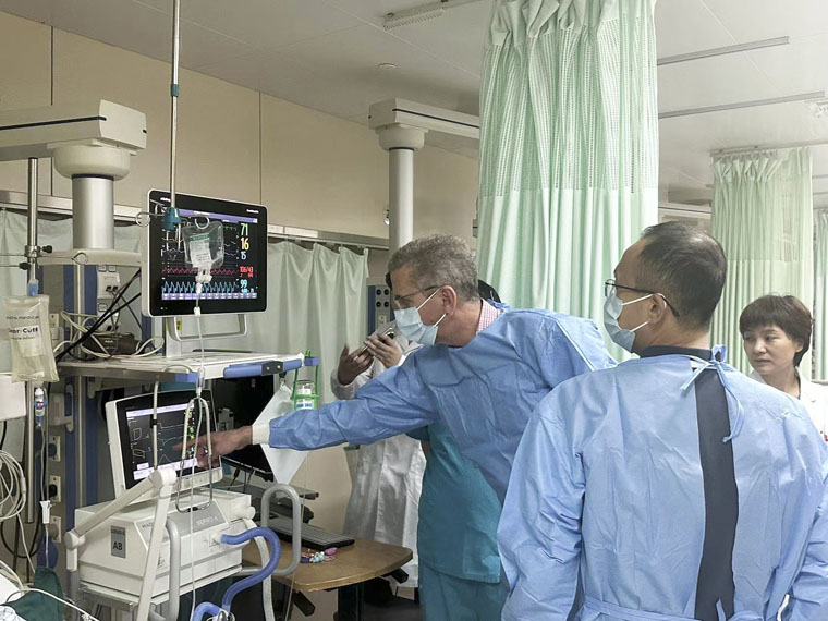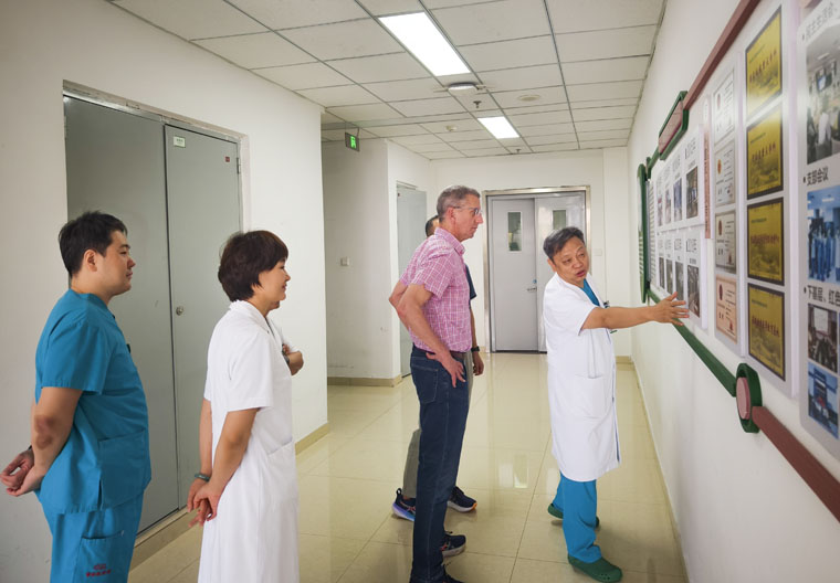 交流现场,胡振杰主任介绍了科室发展情况,并与蔡斯教授深入交流了中新两国重症医学的发展历程。随后,蔡斯教授一行参观了我院重症医学科发展历程展,在病区详细了解各种设备的功能、用途等,对科室高效有序的运作模式表示由衷赞赏。