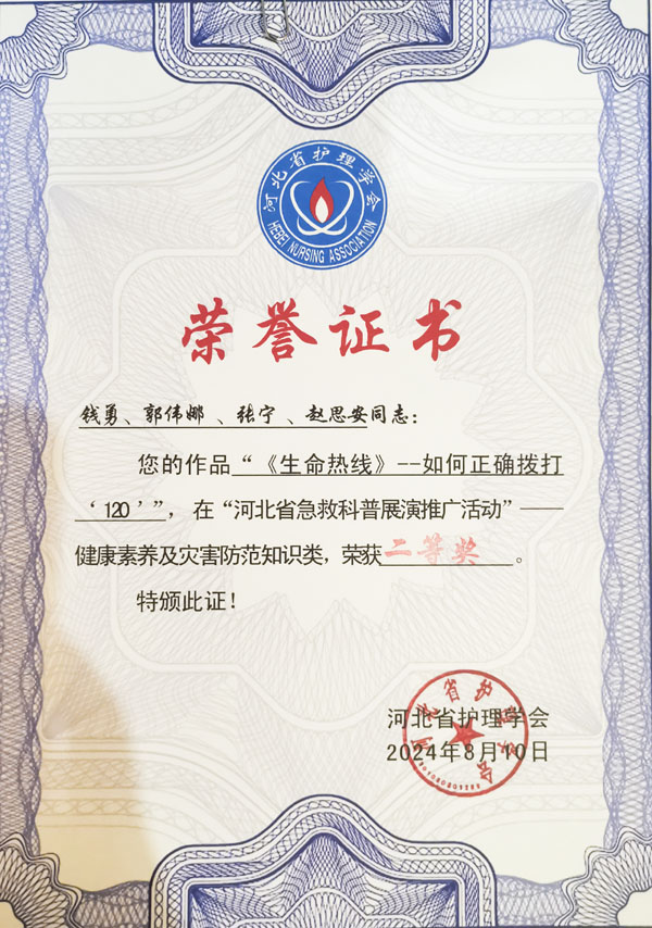 8月8-10日,由河北省护理学会主办的“河北省急救科普展演推广活动”决胜赛在石家庄举办,东院急诊科韩彦敏、王欢、代果、刁志超的作品《一键重启,为生命续航》在“急救技能”板块中勇夺一等奖;本部急诊科钱勇、张宁、郭伟娜、赵思安的作品《生命热线-如何正确拨打120》在“健康素养及灾害防范知识”板块中获得二等奖。