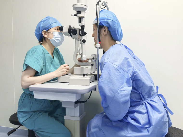 仪式结束后,5名近视患者接受了全飞秒激光手术。角膜屈光手术室外,工作人员进行冲洗、消毒、滴眼等术前准备,宣讲术中配合要点。手术室内,眼科医生有条不紊地操作着全飞秒激光设备,术后均达到了满意的效果。