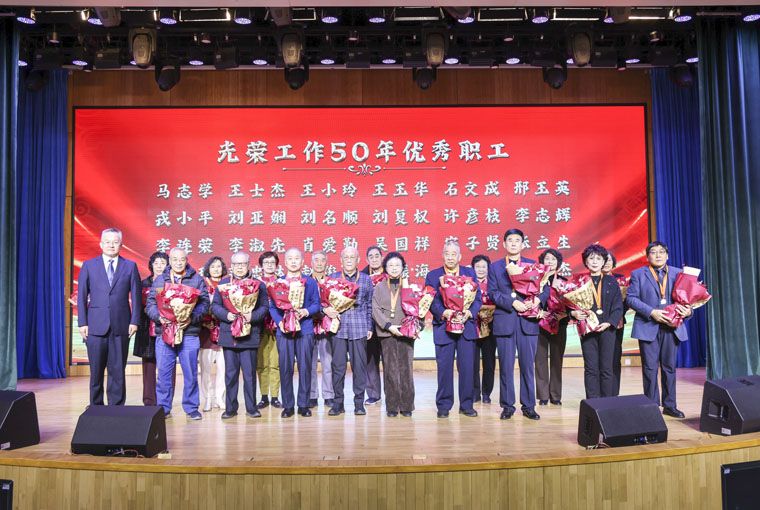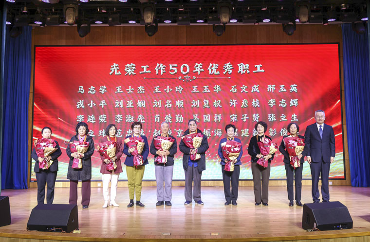 作为本次联欢会的重要环节,医院特别表彰了光荣在岗奉献50年的老专家。李立平书记为每一位老教授佩戴纪念章,代表医院送上诚挚的祝福。