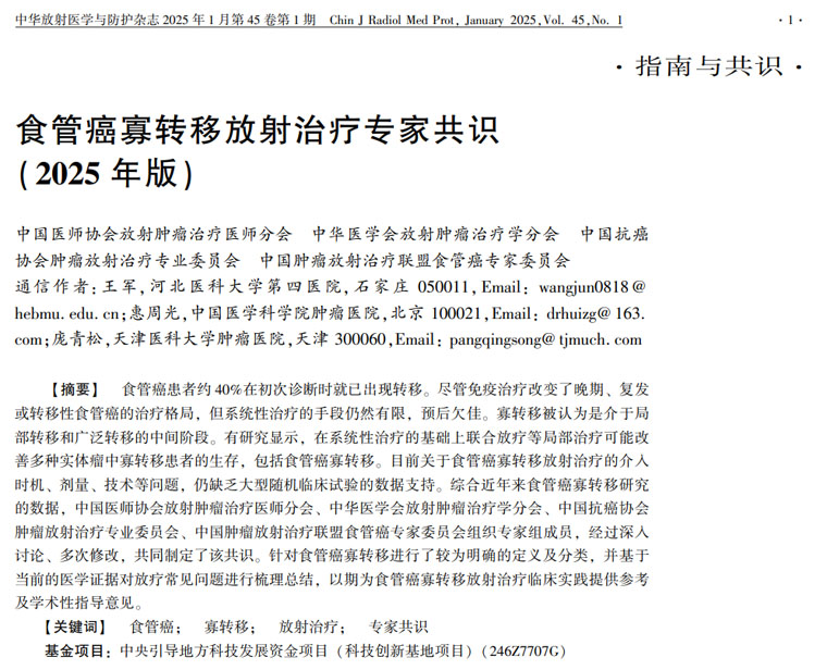 我院放疗科牵头的《食管癌寡转移放射治疗专家共识(2025年版)》在《中华放射医学与防护杂志》发布