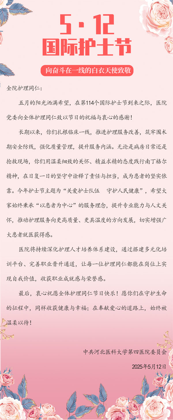 今年5月12日是第114个国际护士节,我院精心筹备策划,开展了一系列丰富多彩活动,向每一位在护理岗位上默默耕耘、无私奉献的白衣天使致以崇高的敬意和真挚的祝福,让护理工作者们在属于自己的节日里,收获温暖与感动,汲取奋进力量。