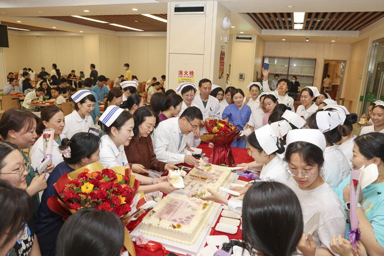 护士节当日中午,院领导李晓玲、何宏涛、魏迎、彭利分别在两院区职工食堂亲手为护理人员派发节日蛋糕,用最朴实的方式向“白衣天使”送上祝福。“大家平时总在病房里给患者送关怀,你们守护患者,我们守护你们”,院领导表示。
