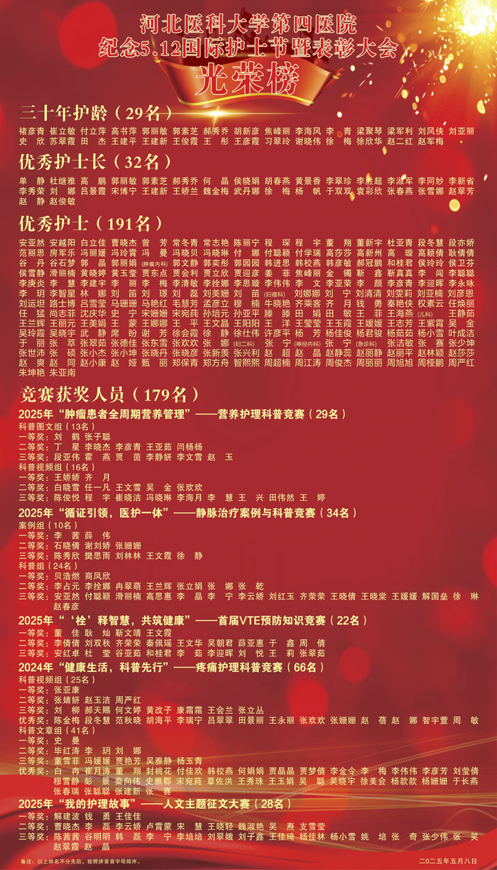 会上,党委副书记、纪委书记李晓玲宣读三十年护龄护理人员名单,副院长赵群宣读2024年优秀护士长、优秀护士名单,总会计师魏迎宣读营养、静疗护理专业小组竞赛获奖名单,副院长田晓玲宣读VTE、疼痛护理专业小组竞赛获奖名单,副院长马景涛宣读“我的护理故事”人文主题征文大赛获奖名单。院领导们依次为获奖个人颁奖。