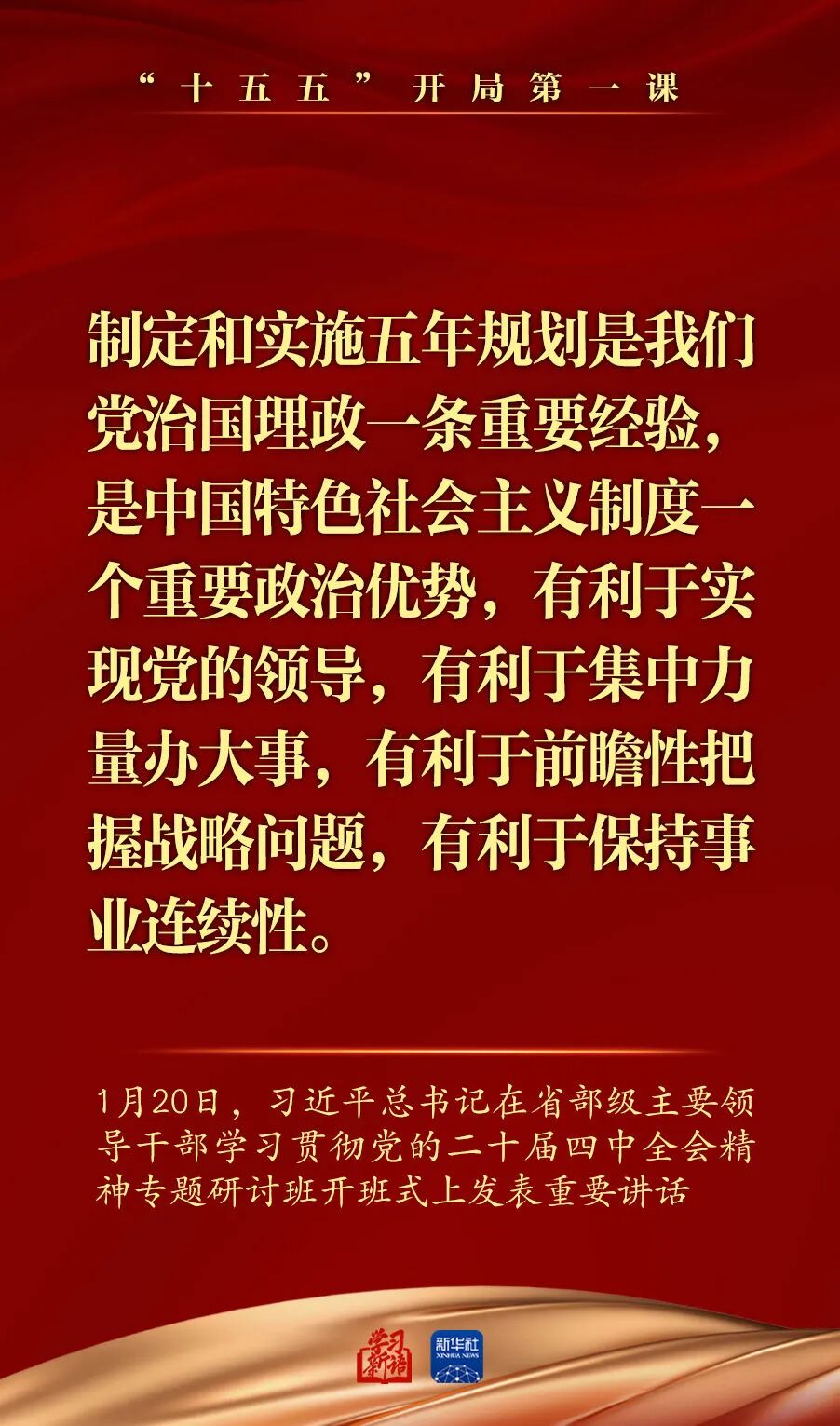 1月20日,省部级主要领导干部学习贯彻党的二十届四中全会精神专题研讨班在中央党校(国家行政学院)开班。习近平总书记在开班式上发表重要讲话强调,深入学习贯彻党的二十届四中全会精神,努力实现“十五五”良好开局。总书记讲话要点,一起学习领悟。