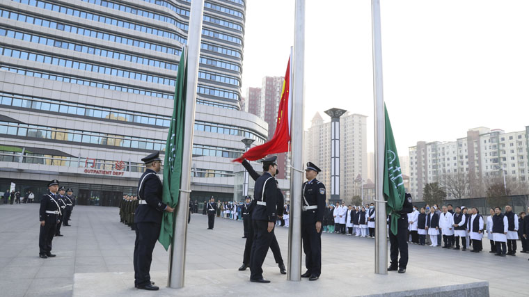 7点50分,随着一声响亮的口令,由医院青年职工组成的国旗护卫队迈着铿锵有力、整齐划一的步伐,护送着鲜艳的五星红旗走向升旗台。在雄壮激昂的国歌声中,全体人员肃然而立,面向国旗行注目礼。