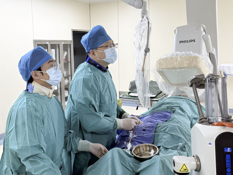 初四凌晨4时,姚铁柱主任医师接到本部急诊电话,一名68岁女性患者因胸痛伴肩背部放射痛14小时前来就诊,经确诊为急性下壁心肌梗死。急诊立即启动胸痛流程送患者至导管室,患者因腰部损伤无法自行移动,医护人员合力将其移送至手术台。术中发现,患者血管情况复杂,右冠完全闭塞,靠前降支提供侧支循环,同时术中患者出现心率减慢、血压降低等情况,姚铁柱主任医师带领团队沉着应对,顺利为患者植入支架,开通血管。该台手术顺利完成后,姚铁柱副主任立即赶赴东院区接续开展救治工作,当日连续完成4台急诊介入手术,以坚守与担当践行医者使命。