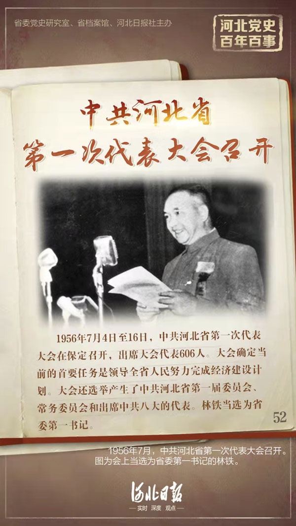 河北的社会主义改造基本完成之后,为总结经验,研究新形势下的新任务,195674日至16日,中共河北省第一次代表大会在保定召开,出席大会代表606人,省委书记林铁作了《建省以来的工作情况与今后任务》的报告,大会审议并通过了副书记阎达开作的《河北省委关于贯彻执行〈1956年到1967年全国农业发展纲要(草案)〉的规划(草案)》。大会确定当前的首要任务是领导全省人民努力完成经济建设计划,要求各级党委要加强对工农业生产的领导,同时做好商业、财政、金融、文教、卫生工作,加强党的建设,反对官僚主义和主观主义。大会还选举产生了中共河北省第一届委员会、常务委员会和出席中共八大的代表。林铁当选为省委第一书记,马国瑞、阎达开、张承先、谷云亭为省委书记处书记。这次大会为加强党的建设和全面社会主义建设做了思想和组织上的准备。