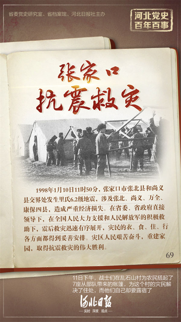 1998年1月10日11时50分,张家口市张北县和尚义县交界处发生里氏6.2级地震,涉及张北、尚义、万全、康保四县,共19个乡(镇)203个行政村16.89万人,造成严重经济损失。当天下午,中共中央总书记江泽民、国务院总理李鹏分别打电话向灾区群众表示慰问。在省委、省政府直接领导下,在全国人民大力支援和人民解放军的积极救助下,震后救灾迅速有序展开,灾民的衣、食、住、行各方面都得到妥善安排。灾区人民艰苦奋斗,重建家园,取得抗震救灾的伟大胜利。