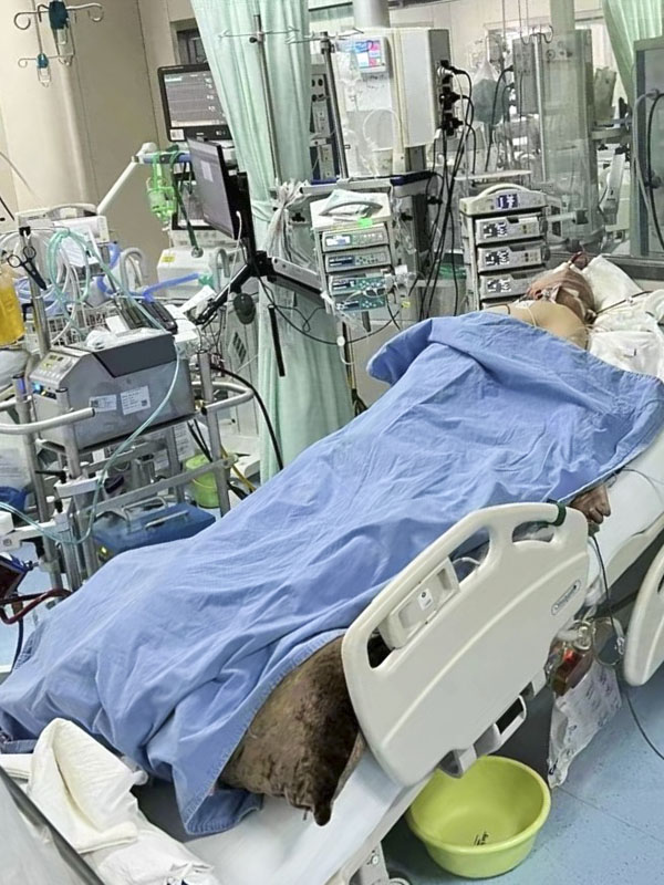 该患者为一名66岁男性,因新冠病毒导致出现“白肺”,在外院治疗后病情始终无好转,家属抱着最后一丝希望来到我院求诊。转入我院后,考虑患者病情极其危重,氧合指数仅50mmHg,在重症医学科胡振杰主任指导下,刘丽霞副主任带领医护人员第一时间给予患者经口气管插管,实施机械通气治疗。然而,患者病情没有明显改善,在极高的呼吸机支持条件下,患者仍然不能有效维持氧合和清除二氧化碳,肺的顺应性仅为个位数,生命危在旦夕。