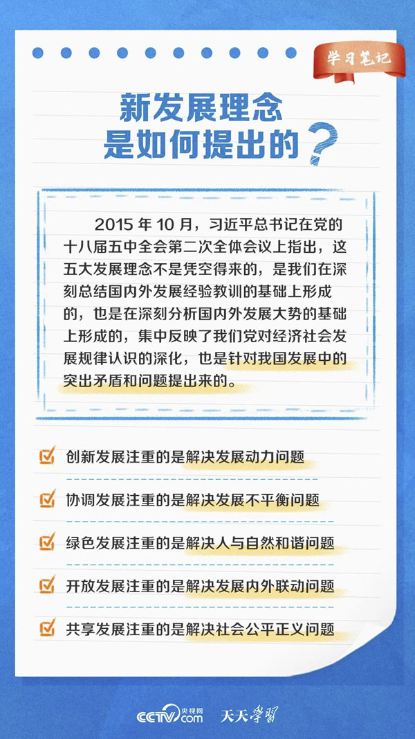 发展是解决我国一切问题的基础和关键。为破解发展难题、厚植发展优势,2015年10月,习近平总书记在党的十八届五中全会上首次提出新发展理念。总书记强调,“新发展理念就是指挥棒、红绿灯”,“贯彻新发展理念是新时代我国发展壮大的必由之路”。