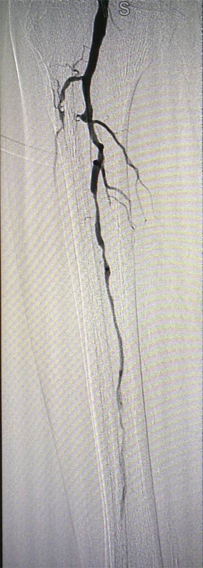 放射科导管室内做好了术前准备,患者由无创呼吸机及各种循环支持下开始介入手术,术中重症监护科严密观察患者的生命体征,内分泌科医生负责手术,患者下肢血流极差,膝下仅存一条多处严重狭窄的腓动脉供血,主要供血的胫前动脉及胫后动脉均长段闭塞,顺行穿刺成功后导丝下行困难,故采用踝下胫后动脉逆穿对接技术成功通过病变。经过近5个小时的奋斗,手术顺利完成,患者腓动脉及胫后动脉血流通畅,血流直达足底动脉环,患者感到足部逐渐温暖,术后清创时患者创面血流丰富。