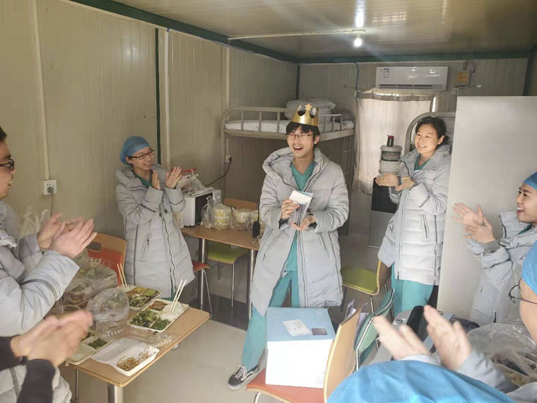 医院早已安排食堂为他准备了生日蛋糕和长寿面。当看到生日蛋糕的那一刻,郭鹏十分惊喜。也就在这一天,他正式向党组织递交了入党申请书,并许下了生日愿望,祈愿早日战胜疫情,所有医务人员平平安安。
