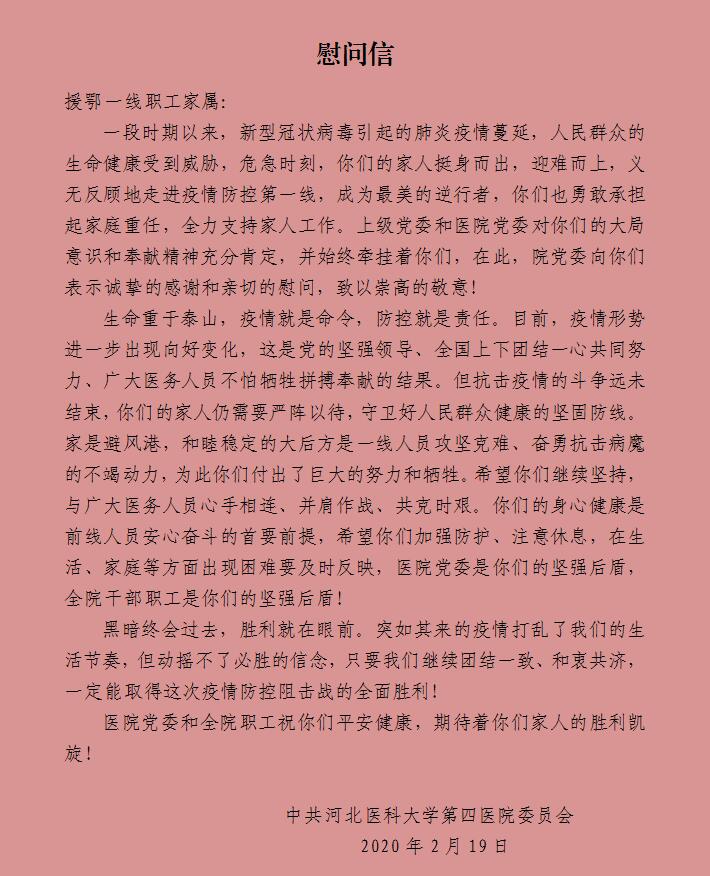 同日,单保恩书记、徐金升院长和李晓玲副书记代表医院党委,慰问了援鄂一线职工的家属,向他们送上了慰问信和慰问金。单书记说,你们的家人在援鄂一线表现突出,得到了各方的一致肯定,这与你们的无私奉献是分不开的。你们也是我院职工,在大力支持援鄂队员的同时,还做好了医院的本职工作,在此我代表医院党委向你们表示诚挚的感谢!