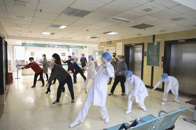 受新冠肺炎疫情的影响,由于不能随意外出,病房里的肿瘤患者和家属除了日常的治疗外,生活相对单调,情绪略显低落。为了增添兴趣和乐趣,鼓励大家重燃生活的激情,放一科赵静护士长和科主任协商后,自学《回春医疗保健操》,在科室中厅架起屏幕并亲自“领舞”,鼓励大家积极参与其中。起初,大部分患者及家属有些扭捏,但看到舞蹈动作容易上手,在护士们的鼓励下纷纷加入其中。他们戴好口罩,前后左右保持一米的距离,跟随视频指导,互相学习,很快进入了状态。