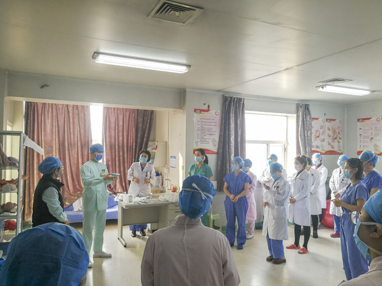 东院产科成员积极参与新冠肺炎孕产妇定点医院产儿隔离病区工作制度和流程的制定与修改,就每一版新冠肺炎病毒的诊疗和防治指南进行讨论和学习。东院产科护士长张晓丽和副护士长田玉玲、任玮娜对科室每位护理人员进行防护措施的培训、考核、再培训、再考核,确保每位医护人员对穿脱隔离服、病人就诊流程、医护人员上岗流程烂熟于心,努力将科室所有人员都培养成召之即来,来之能战,战之必胜的精兵强将。
