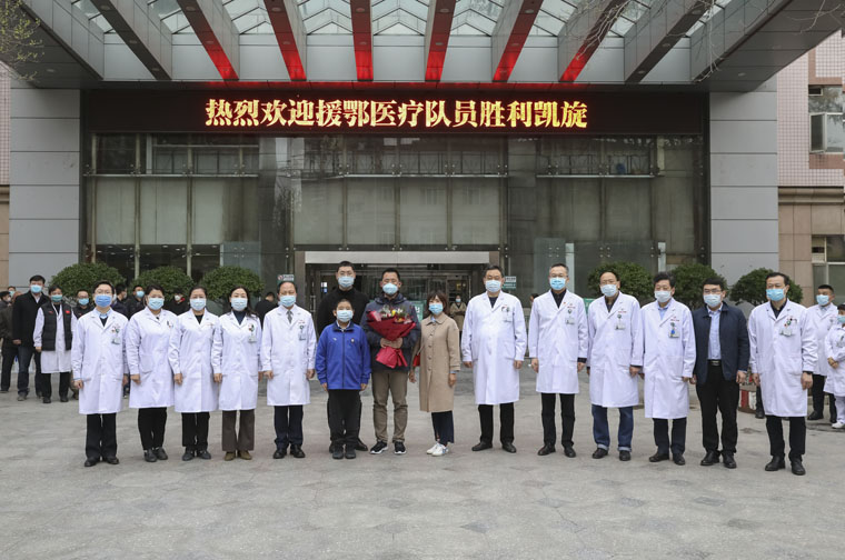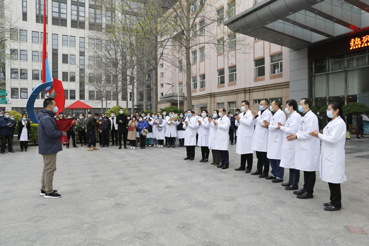 在医院前厅广场,党委书记单保恩、院长徐金升和医院领导班子全体成员、部分干部职工及其家属一起迎接他回家。单保恩书记代表院党委向刘辉及其家属表示敬意和感谢。