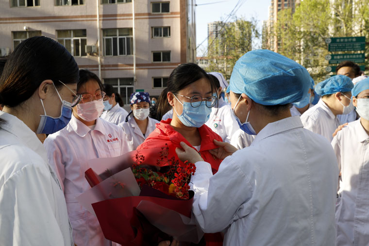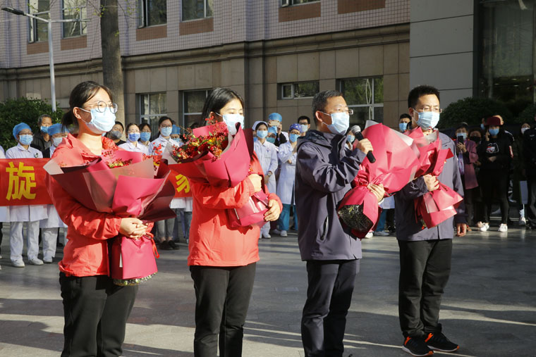 4月3日下午,河北省首批援鄂医疗队员,我院重症医学科病区主任朱桂军、副护士长申康康,感染性疾病科副主任杨大运、呼吸内科护师王亚美结束隔离,平安归来。