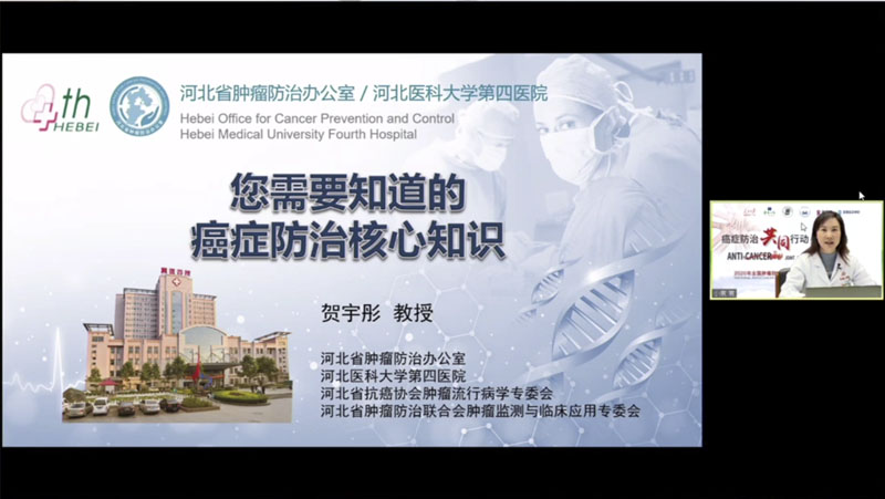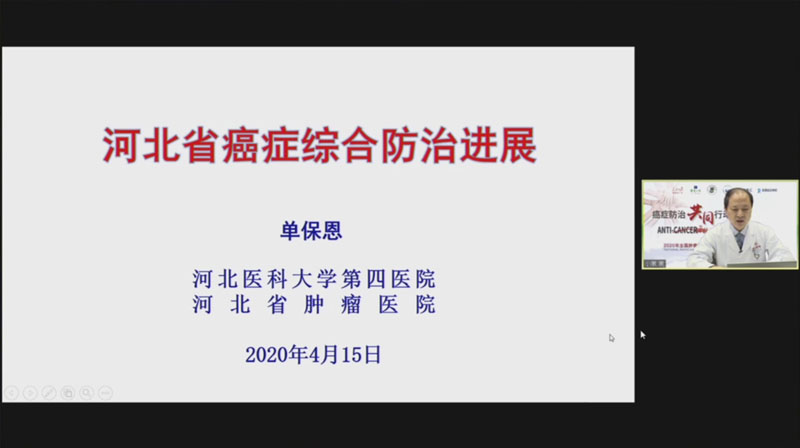 4月15日上午9时,第26届全国肿瘤防治宣传周河北启动仪式以云直播的方式拉开帷幕,本次活动由河北省卫生健康委员会主办,我院、河北省抗癌协会、河北省肿瘤防治办公室承办,以“抗癌路上 你我同心”、“癌症防治 共同行动”为主题,8350余人观看在线直播,积极互动,还参与了线上答题发红包活动。由于目前正处于新冠肺炎疫情防控期间,本年度系列活动均在线上举行。