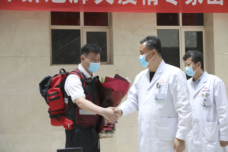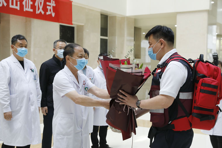 壮行仪式上,党委书记单保恩代表医院党政领导和全院职工对王琦同志关键时刻挺身而出、勇于奉献的精神表示衷心的感谢,并为他献上代表胜利的鲜花。单书记说到,“今年年初新冠肺炎疫情肆虐我国,给全国人民的生命健康带来了威胁,但是在习近平总书记和党中央的正确领导下,经过全国人民共同抗击,疫情发展得到了有效的控制,同时我们也积累了一定的经验。目前,国际防控工作不容乐观,习近平总书记指出,流行性疾病不分国界和种族,是人类共同的敌人。国际社会只有共同应对,才能战而胜之。今天,王琦同志肩负着我院、河北省、国家的光荣使命,远赴非洲执行新冠肺炎的救助任务。希望你把自己精湛的技术和勇于奉献、不怕吃苦的四院精神也带到那里,出色的完成任务。”单书记还嘱咐到,“医院党委和全院职工是你最坚强的后盾,会为你解除一切后顾之忧,祝你此行一切顺利。”徐金升院长等领导也纷纷叮嘱王琦在克服困难、完成工作的同时,时刻做好安全防护,保护自身安全。