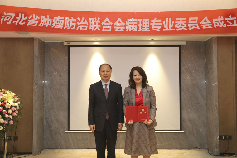 1017日,由河北省肿瘤防治联合会主办,我院病理科承办的河北省肿瘤防治联合会病理专业委员会成立大会暨河北省肿瘤防治联合会病理专业委员会第一次学术会议以线上线下相结合的形式召开,我院刘月平教授当选第一任主任委员,河北省肿瘤防治会主席单保恩教授为刘月平教授颁发证书。