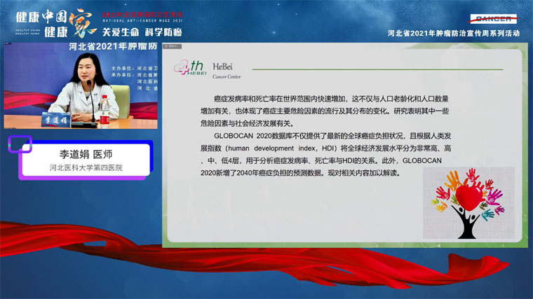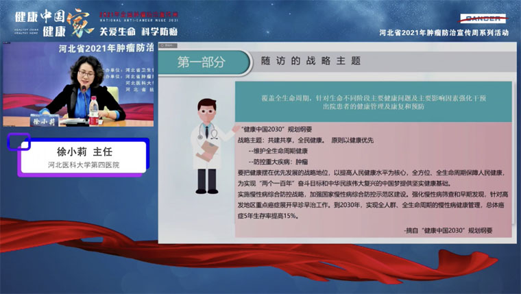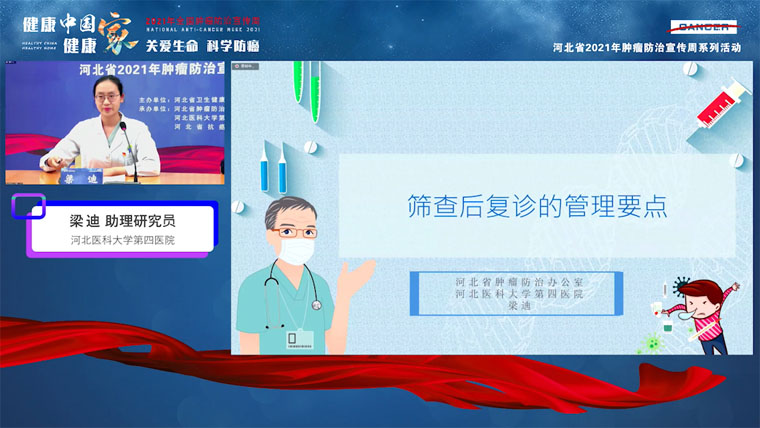 4月15-21日是我国第27个全国肿瘤防治宣传周,今年宣传周的主题是“健康中国健康家——关爱生命 科学防癌”。河北省省委、省政府深入贯彻落实党中央、国务院对癌症防治工作的决策部署,为推动落实《健康河北行动癌症实施方案》,提高全社会癌症防治意识,营造全民防癌抗癌的良好氛围,由河北省卫健委主办,我院和河北省肿瘤防治办公室联合承办的“河北省2021年肿瘤防治宣传周活动”以云直播的方式进行。活动由业内知名专家进行授课、解答,线上观众达98万余人,广大受众收获了知识,癌症患者收获了信心。