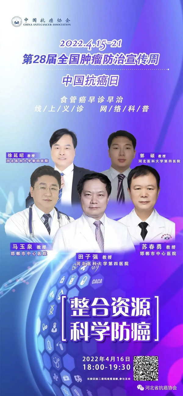415-21日是我国第28个全国肿瘤防治宣传周,今年宣传周主题是“整合资源 科学防癌”。为贯彻落实健康中国癌症防治行动,进一步提高全社会癌症防控意识,营造全民防癌抗癌的良好氛围。由河北省抗癌协会、河北省肿瘤防治办公室主办的第28届全国肿瘤防治宣传周/中国抗癌日,河北省启动仪式将于2022415日在保定正式启动。