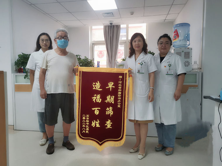鹿泉区的张女士在看到“河北省城市癌症早诊早治项目”的相关宣传报道后,到指定社区参加此项目,通过填写防癌风险评估问卷和三项生物学检测后,被系统评估为乳腺癌的高危人群,相关社区安排张女士到我院进行乳腺超声和钼靶的免费筛查,排除了相关隐患。为了表达对参与该项目的感谢,张女士将写有“为百姓办实事儿,体检服务暖人心”的锦旗送到河北省肿瘤防治办公室。
