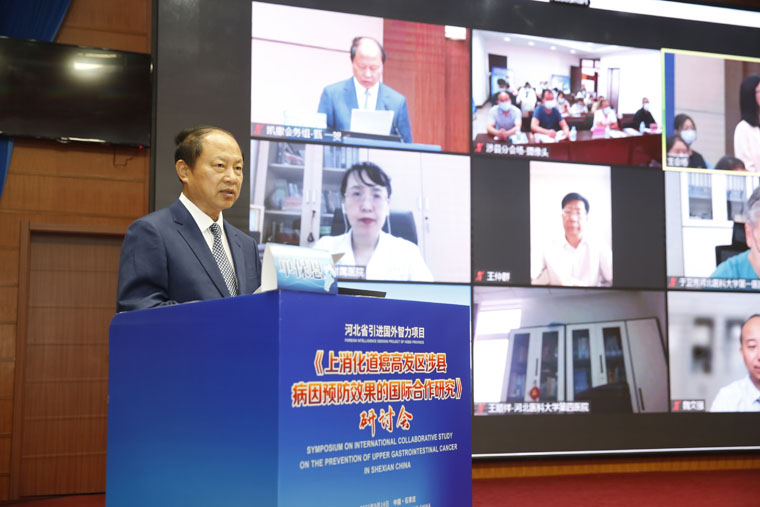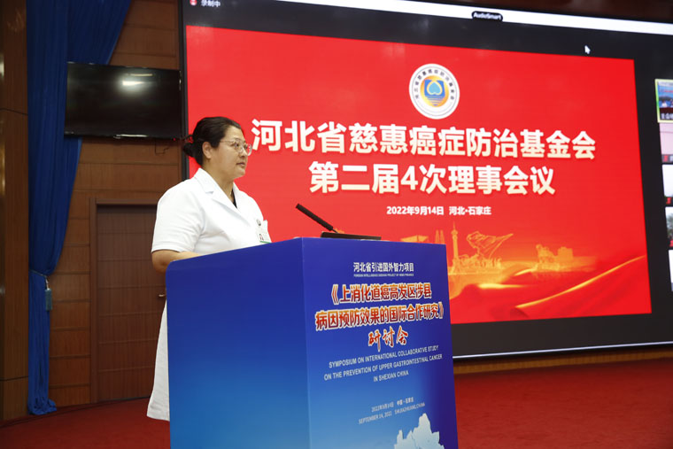914日,由外国专家局主办,我院和河北省慈惠癌症防治基金会承办的河北省引进国外智力项目《上消化道癌高发区涉县病因预防效果的国际合作研究》研讨会在东院区多功能厅召开。省科技厅一级巡视员郭明玉、省卫生健康委二级巡视员周志山、省外专局局长王仲群在线上出席会议。我院党委书记单保恩,癌症基金会名誉理事长王士杰教授,我院副院长、基金会理事长耿翠芝,总会计师、基金会监事魏迎,副院长、基金会副理事长兼秘书长何宏涛及癌症基金会理事出席会议。会议还设立涉县分会场。