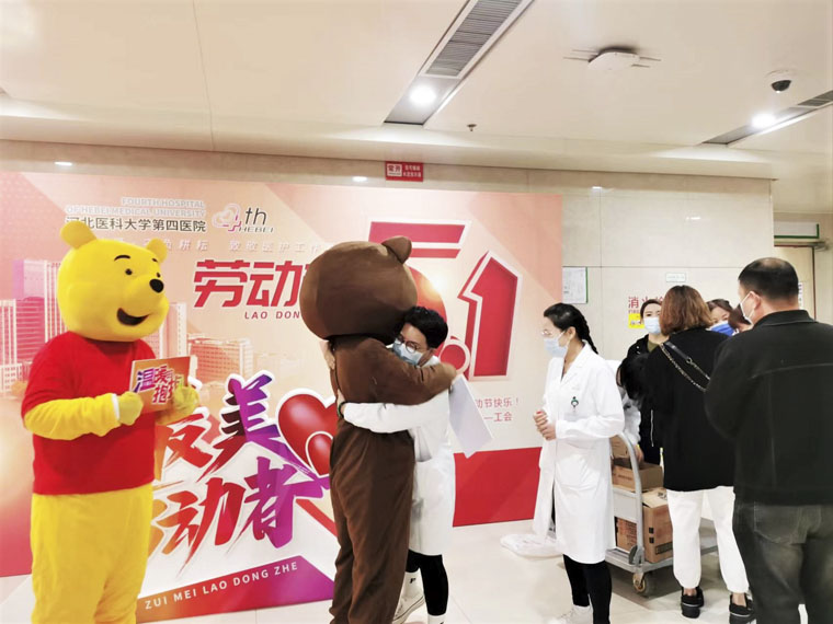 活动中,工会的两位职工穿上布朗熊和维尼熊的人偶,向职工们“温暖的拥抱”、赠送护手霜,并向大家道一声“辛苦了”!很多职工表示,通过活动收获了来自医院的关怀和温暖,劳动最光荣,奋斗最幸福,新时代更要立足岗位、脚踏实地,用辛勤劳动创造更加美好的明天。