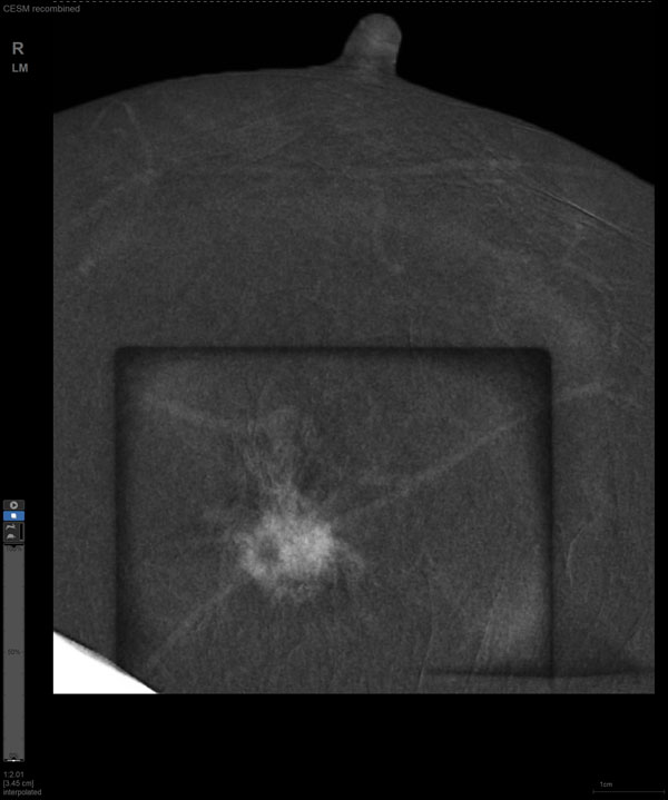 CEM作为近年来新兴的乳腺成像方法,是在传统乳腺X线摄影的基础上,通过静脉注射碘对比剂,用高低两种能量的X线摄影通过计算机进行能量减影处理,得到的减影像能突出显示病灶强化特征的一项新技术。其优势在于,既能显示乳腺病变的形态学特征,又能反映病变新生血管的血供情况,被越来越多地应用于临床。