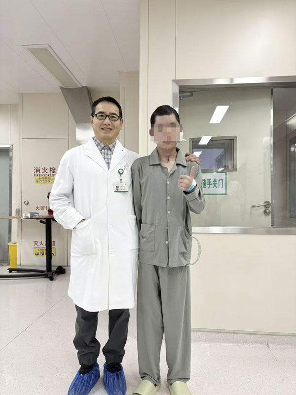 近日,我院急诊科接诊了一名19岁特殊的危重患者,他在骑行过程中遭遇车祸,被货车后箱门卡伤颈部,气管断裂,危在旦夕。生死关头,我院胸五科陈新主任医师带领团队为患者进行了气管重建手术。之后,患者转入ICU病区,在ICU、胸外科、耳鼻喉科等相关科室的通力协作下,克服了肺炎、营养衰竭等难关,终于脱离呼吸机拔管、下床活动,伤后50天,顺利转至康复机构进行后续恢复。