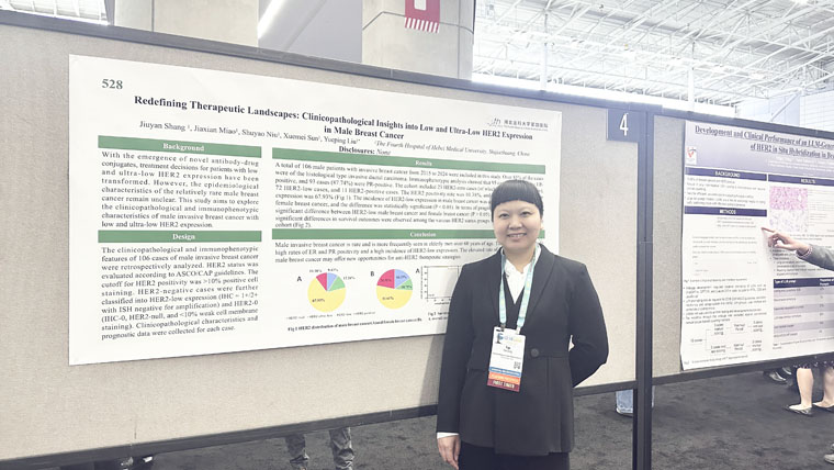 在发言环节,病理科丁妍副主任和李金泽医生代表科室参会,她们以严谨的研究方法、详实的数据和清晰的思路向全球同行展示了乳腺病理最新研究成果,现场专家表达了浓厚兴趣,引发了热烈讨论和交流。在壁报展示区中,病理科的5篇壁报涵盖了肿瘤病理、分子病理、人工智能辅助病理诊断等多个领域,吸引了众多参会者的驻足讨论,展示了科室在病理学研究方面的多元化和创新性,获得了现场专家的高度认可。