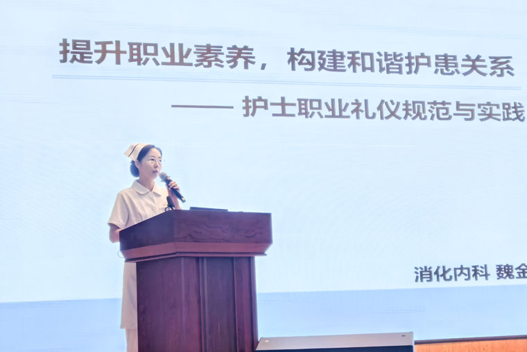 消化内科护士长魏金梅对护士仪表礼仪、言谈礼仪和体态礼仪,以及护士日常工作礼仪等多方面开展护士职业礼仪培训,帮助同学们塑造专业、规范的职业形象,提升职业素养,构建和谐护患关系。