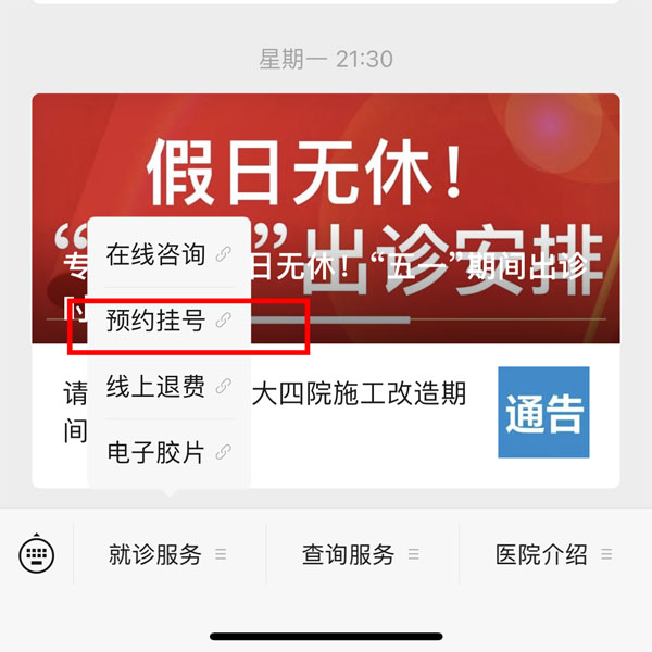 或,微信服务号搜索关注“河北医科大学第四医院”