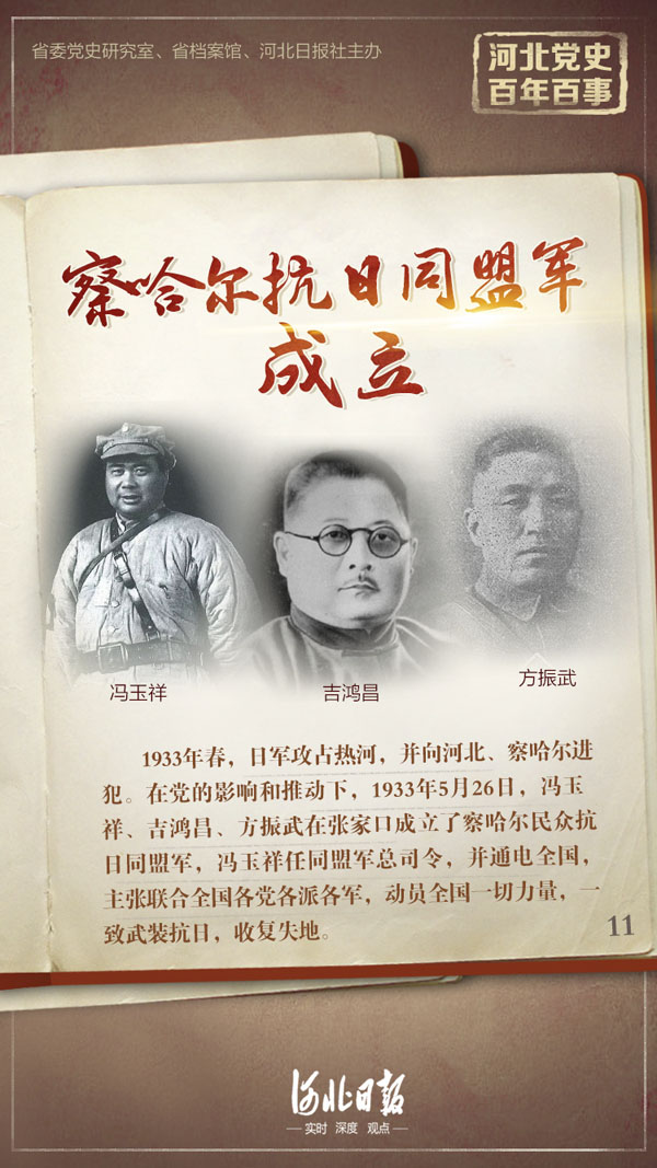 1933年春,日军攻占热河,并向河北、察哈尔进犯。在党的影响和推动下,1933年5月26日,冯玉祥、吉鸿昌、方振武在张家口成立了察哈尔民众抗日同盟军,冯玉祥任同盟军总司令,并通电全国,主张联合全国各党各派各军,动员全国一切力量,一致武装抗日,收复失地。中共党组织从北平、天津、张家口及华北各地动员了大批共产党员和学生到同盟军中工作,在各部队中建起党支部。