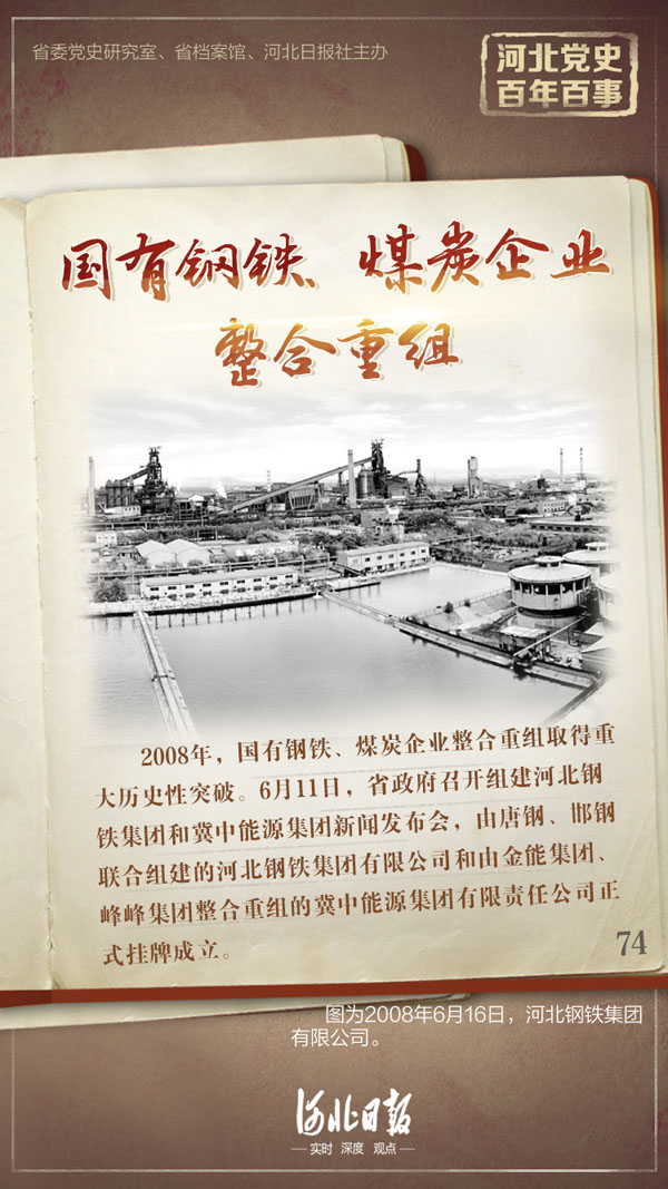 2008年,国有钢铁、煤炭企业整合重组取得重大历史性突破。6月11日,省政府召开组建河北钢铁集团(唐钢集团、邯钢集团)和冀中能源集团(峰峰集团、金能集团)新闻发布会,由唐钢、邯钢联合组建的河北钢铁集团有限公司和由金能集团、峰峰集团整合重组的冀中能源集团有限责任公司正式挂牌成立。组建河北钢铁、冀中能源两大集团公司是省委、省政府从全省经济社会发展实际出发,顺应国内外产业发展趋势,贯彻落实国家产业政策,提高产业集中度和综合竞争力,推动钢铁、煤炭产业优化升级的重大战略决策。